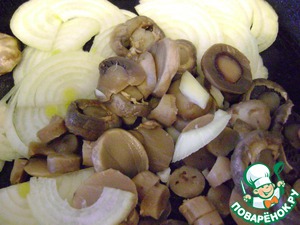• Лук нарезать полукольцами. Шампиньоны нарезать кольцами и обжарить с луком.