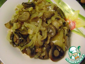 Лук нарезать полукольцами. Шампиньоны нарезать кольцами и обжарить с луком.