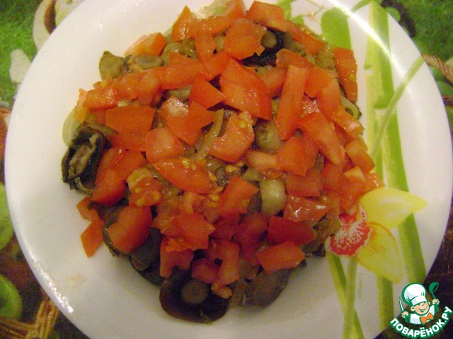 • Третий -нарезанный кубиками помидор. Посолить.