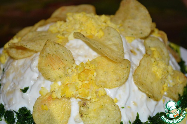 • Верхний слой промазать майонезом. Украсить желтком-это серединка цветка, чипсы-лепестки орхидеи. Петрушку разложить по окружности салата.