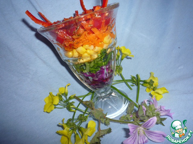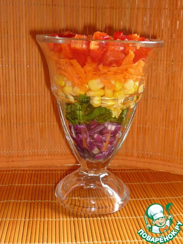 • В большой бокал или прозрачную салатницу выкладываем слоями: капуста - зелень - кукуруза - морковь - перец.