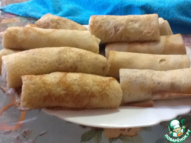 Для приготовления рулета выпекаете блины по любому любимому рецепту.