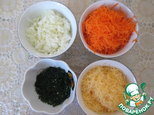Лук мелко порезать, морковь сыр натереть на мелкой терке, укроп мелко порубить (у меня мороженный).