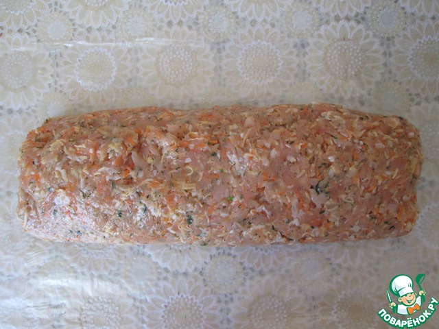 С помощью пищевой пленки соединить края фарша (у меня таковой не оказалось и я заменила ее разрезанным пакетом).