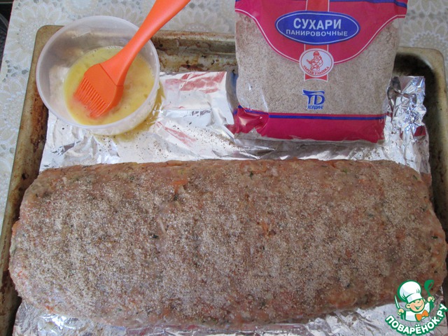 Рулет положить швом вниз на смазанный маслом противень (я уложила на фольгу). Сверху смазать взбитым яйцом и посыпать сухарями. Запекать 30-40 мин. при 180 градусах.