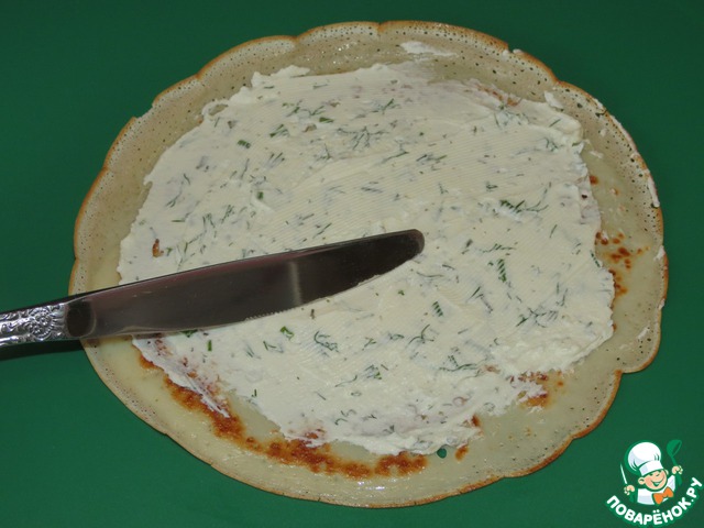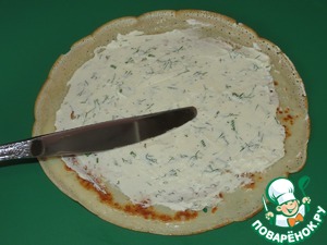 На блинчик выложить по 1 ст. л. сыра и разровнять.