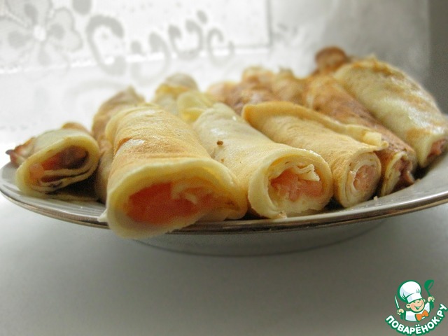 Разрезать блины пополам, выложить на блюдо. Украсить кусочками лосося и укропом.
