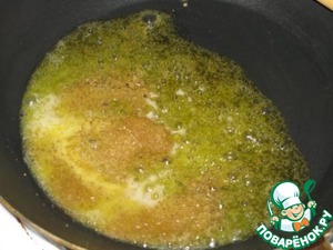 В сковороду положить половину сливочного масла и сахар, помешивать, пока сахар не растает.