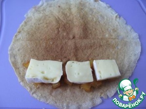 На блинчик кладем яблоки, сверху ломтики сыра.
