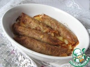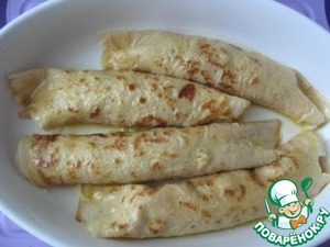 Блинчики уложить в форму для запекания, смазать сверху оставшимся сливочным маслом (растопленным), поставить в разогретую до 180° духовку на 5-7 минут, пока сыр не растает.