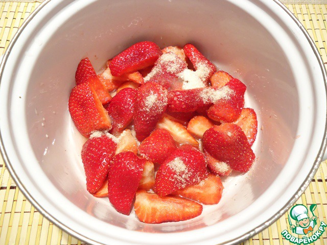 Клубнику моем, удаляем плодоножки. Если клубника крупная, разрезаем ее на несколько частей.