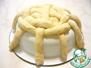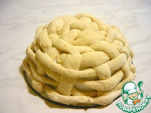 тесто разделяем на части и скатываем их в жгутики (не слишком длинные), затем начинаем плести корзину. Один небольшой кусочек теста оставляем для того, чтобы сделать ручку.