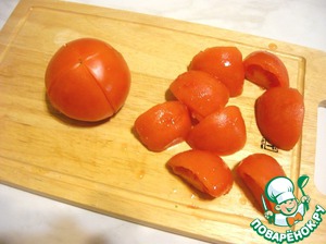 Помидоры надрезаем крест-накрест, ошпариваем кипятком, снимаем кожицу и нарезаем на 4-6 частей.