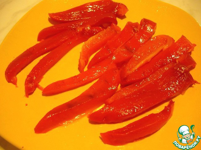 Перец отправляем запекаться в духовку на 7 минут, затем очищаем от кожицы, удаляем семена
