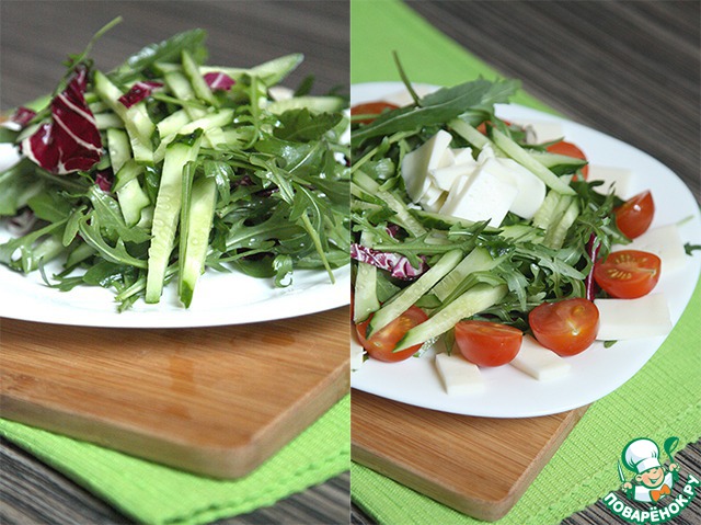 Вокруг разложить помидоры и моцареллу, остатки сыра уложить в центр, салат посолить и полить оливковым маслом.