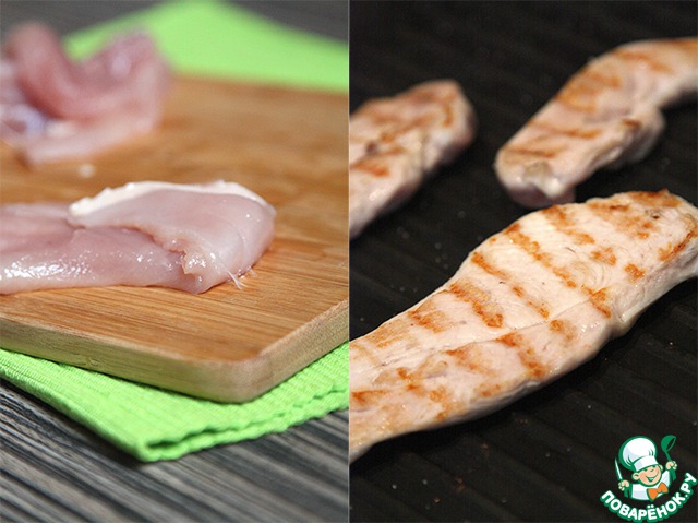 Куриную грудку нарезать вдоль, чтобы куски были толщиной 1-1,5см и обжарить БЕЗ МАСЛА на сковороде-гриль.