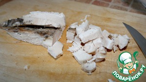 Куриную грудку отварить или запечь. Я запекла предварительно её посолив и поперчив. Остудить и нарезать на небольшие кубики.