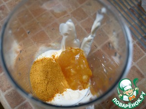 Теперь нужно приготовить соус. Смешать майонез с йогуртом, добавить апельсиновый джем и карри. Взбить миксером на малой скорости.