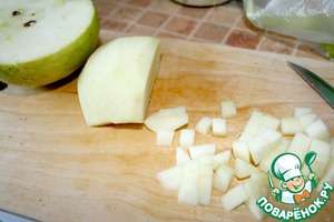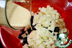 • Яблоки очистить от кожуры и мелко порезать. Добавить в салат.