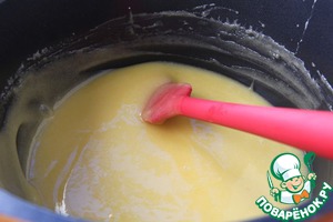 Далее переливаем смесь в сотейник и нагреваем на маленьком огне, чтоб смесь стала однородной и ушел эффект простокваши. После увеличиваем огонь до среднего и варим постоянно помешивая пока масса не загустеет. Ни в коем случае она не должна закипеть, температура не должна превышать 77C.