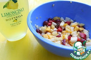 Добавьте ликер лимончелло перемешайте и отправьте в холодильник минут на 10. Еще один момент, если вы хотите, чтоб в ваш салат входили бананы, то их нужно добавить в самом конце. -