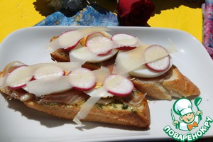 Вареные яйца охлаждаем и очищаем, нарезаем и кладем на ветчину. Редис тонко нарезать и посолить. Это наш следующий слой. Сверху с помощью овощерезки или сырорезки нарезаем тонкие полоски пармезана. Все сэндвич готов! -