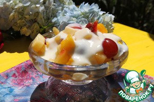 Быстренько достаем наш фруктовый салат и не забываем про банан, если есть желание его добавить, то сейчас самый момент, нарезаем и аккуратно перемешиваем. Раскладываем по креманкам и поливаем заправкой.