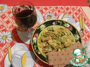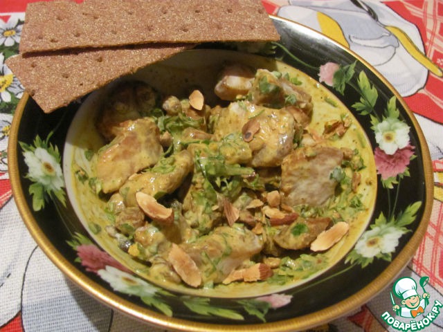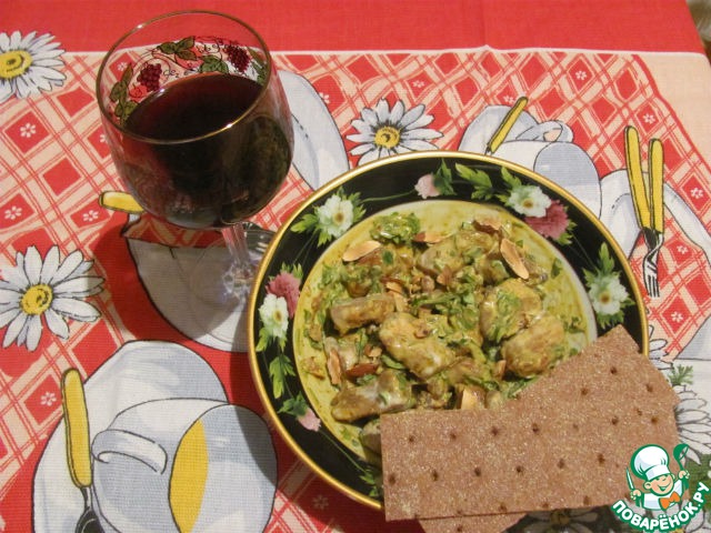 Мясо нужно отварить в подсоленной воде, но мне почему то, вопреки рецепту захотелось его пожарить и наверное зря. Отварное полезней и если его жарить, главное-не засушить. Что у меня и получилось. Ну я не отчаялась. Теперь смешиваем всё в миске: сметана+карри+миндаль немного раздавить+зелень+изю м+перец=перемешиваем , добавляем мясо, нарезанное кубиками, ещё раз перемешали и можно звать мужа на романтический ужин!!!