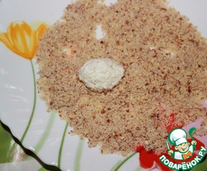 Конфету (в моем случае это был изюм в шоколаде) помещаем в шарик из творожной массы и формируем продолговатые овальчики.