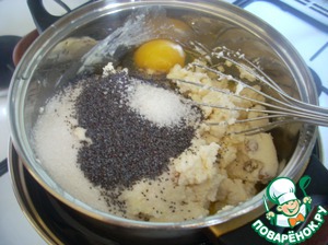 Смешать все ингредиенты для теста: просеять муку с разрыхлителем, добавить размягченное масло, сахар, яйцо, мед, сметану и соль.