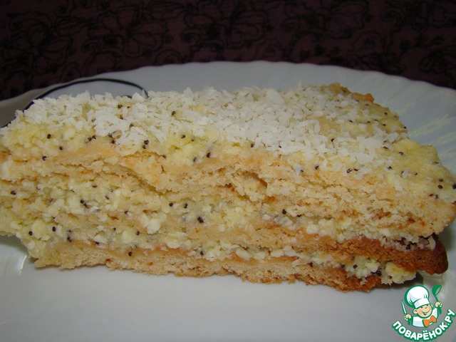 [+4]Я в творожный крем добавила 1 ст.л. мака - для красоты и хрусткости и 2 ст.л. кокосовой стружки - для аромата и вкуса. Сверху также украсила кокосовой стружкой, всего ее у меня ушло 40 г.