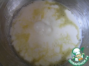 Яйцо немного взбить с сахаром и солью, влить молоко, перемешать.