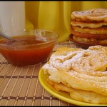 Тесто поместить в кондитерский шприц (или пакет с отрезанным уголком), чем меньше будет насадка, тем красивее будут Ваши блинчики. Выдавливать тесто нужно по спирали в виде кружев, оно сразу начнет увеличиваться, тем самым скрепляя спирали.