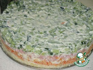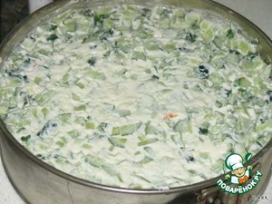 Все ингредиенты по отдельности смешать с майонезом. Выложить продукты слоями в разъёмную форму в произвольном порядке. (я делала - картошка - морковка - колбаса - яйца - огурец)