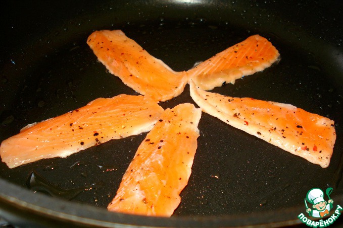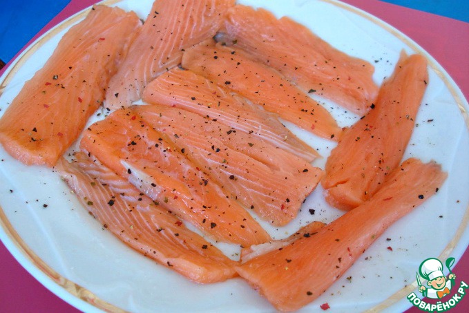 В оригинале была малосолёная сёмга (автор говорит что именно она даёт солёность блинчикам и нужную изюминку), но у меня оной не оказалось. Зато был кусочек свежей сёмги. Я его порезала на небольшие ломтики, посолила, поперчила и отставила на пару часиков в сторонку.