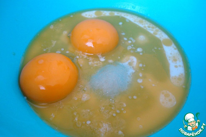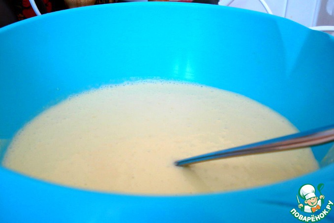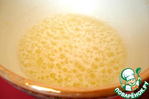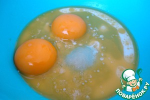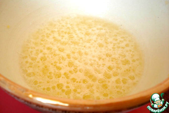 Сливочное масло растопить, добавить два желтка, сахар и хорошенько размешать.
