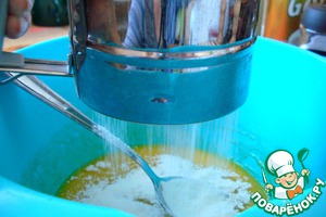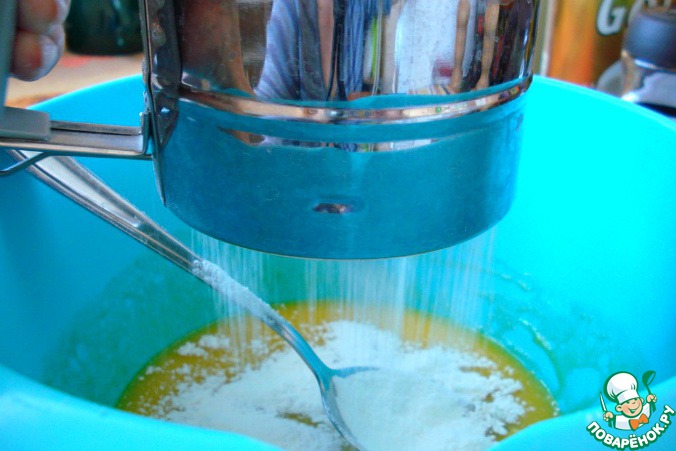В тесто постепенно вливаем кефир и размешиваем чтобы небыло комочков. Добавляем взбитые белки и аккуратно перемешиваем.