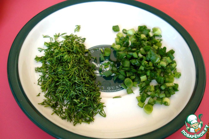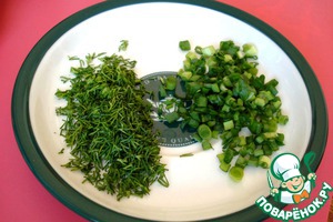 Зелень мелко рубим. У меня был зелёный лук и укроп.