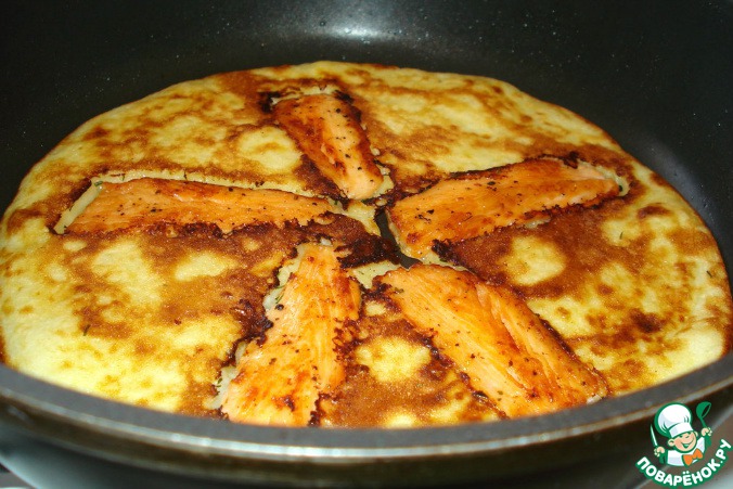 На разогретую сковороду кладём ломтики сёмги. В оригинале автор сыпала зелень на сковороду. Я попробовала один блин, мне не понравилось (зелень очень прижарилась). Поэтому следующие блины жарила без зелени.