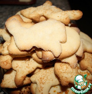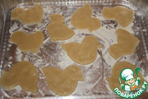 Раскатать тесто примерно до 3 мм толщиной, вырезать любыми формами, поставить в разогретую до 220 градусов печь на 10 мин.