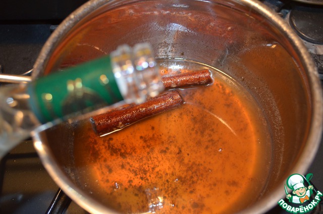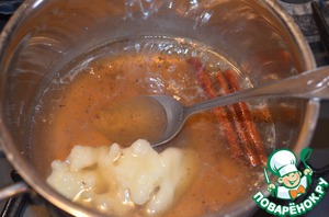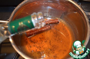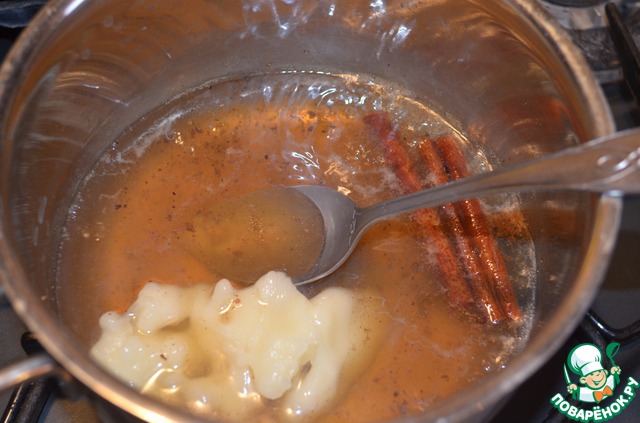Тщательно размешать мед. Варить сироп на медленном огне, чтобы пряности отдали ему свой аромат, пока объем не уменьшится наполовину. -