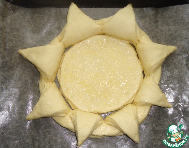 Выложить в середину будущего пирога, дать немного подойти, смазать растительным маслом или яйцом. Выпекать при температуре 180-200 градусов 30-35 минут.