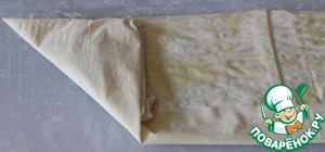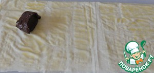 А вот с пикантной начинкой я использую один лист теста и разрезаю его на три полоски. Далее все точно так же, как и с шоколадной начинкой. Только время выпекания чуть-чуть уменьшится. В принципе, и шоколадную начинку можно складывать в один лист, но у меня слишком большая форма для льда, где я замораживала шоколад. Шоколадные квадраты вышли большими.