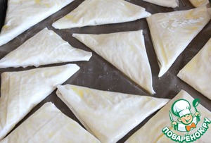 Разогреваем духовку до 200 С. На застеленный противень выкладываем треугольники и верх еще раз смазываем маслом.