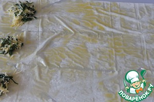 Достаньте тесто фило, разложите его на рабочей поверхности. т. к. оно очень быстро высыхает, поверх теста положите влажное полотенце.