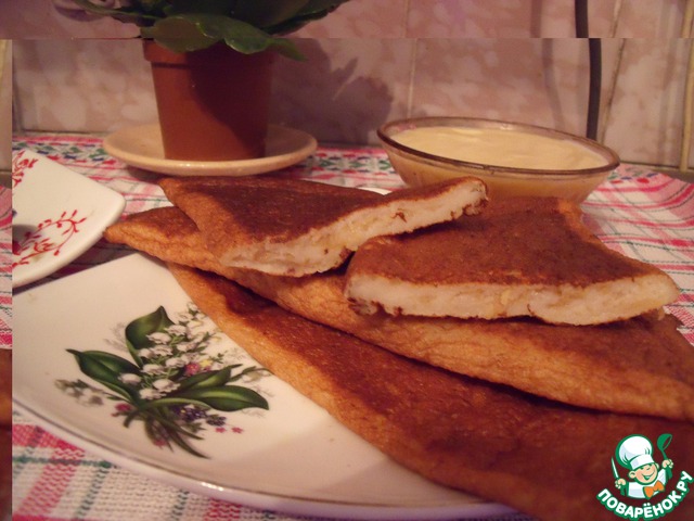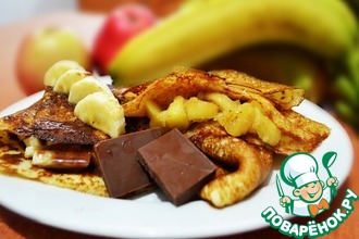Мужу очень понравились блины с яблоком. А я с удовольствием съела сырные, получились такие блинные "хачапури". На фото - с яблочной начинкой.