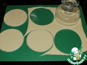 Слегка раскатать тесто на припыленной мукой поверхности и вырезать формой диски, диаметром 10 см.