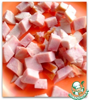 • Нарезаем кубиками ветчину и куриную копченую грудку.