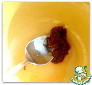 • Ответственный шаг - готовим заправку. Весь смак, смысл, одним словом, весь салат - именно заправка. Сок апельсина, оливковое масло и аджику тщательно перемешиваем до однородности.