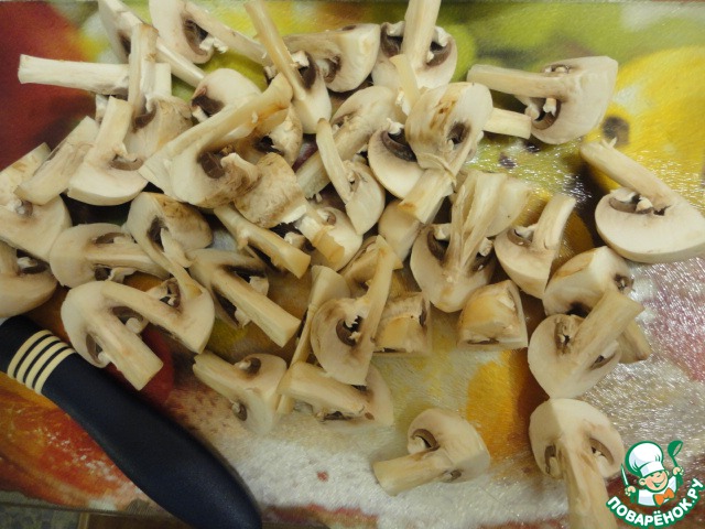 Шампиньоны вымыть, обсушить и нарезать на четвертинки. Обжарить в сливочном масле 2-3 минуты, на сильном огне.